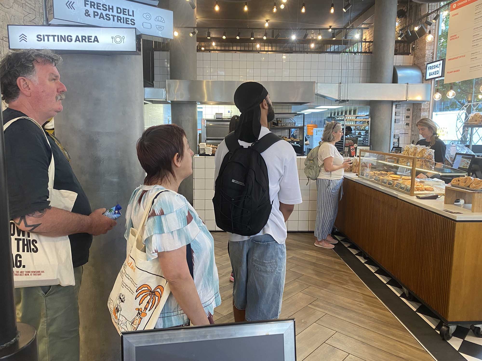 See above: The guy with the backpack has ordered and paid, and is waiting to collect. The two people behind him are waiting to order at the till way back over there.
